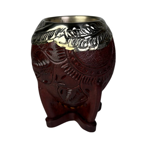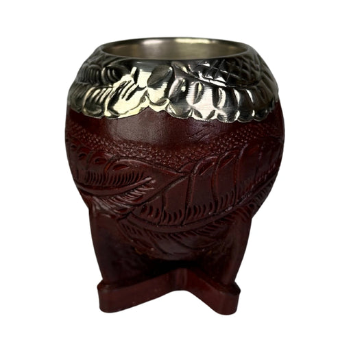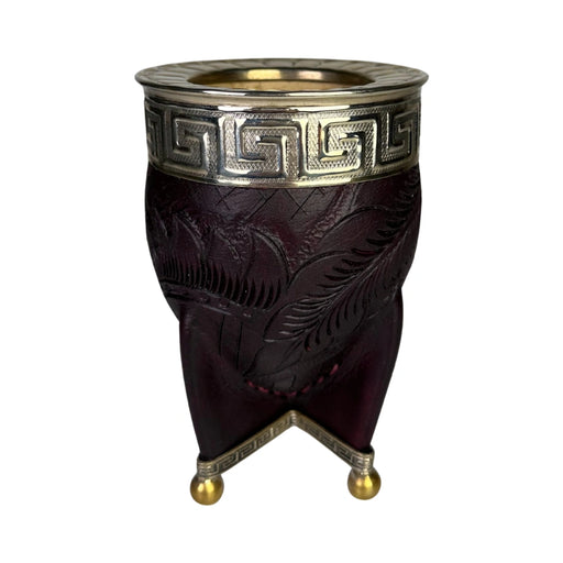 Ver todos los detalles[ACORDEON:DESCRIPCION]🧉 Mate Imperial Borravino – Artesanía en cuero labrado y alpaca Este mate imperial de calabaza destaca por su estética profun...