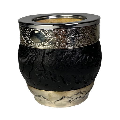 Ver todos los detalles[ACORDEON:DESCRIPCION]🧉 Mate Imperial Negro – Artesanía en cuero labrado y alpaca Este mate imperial de calabaza destaca por su estética sobria y s...